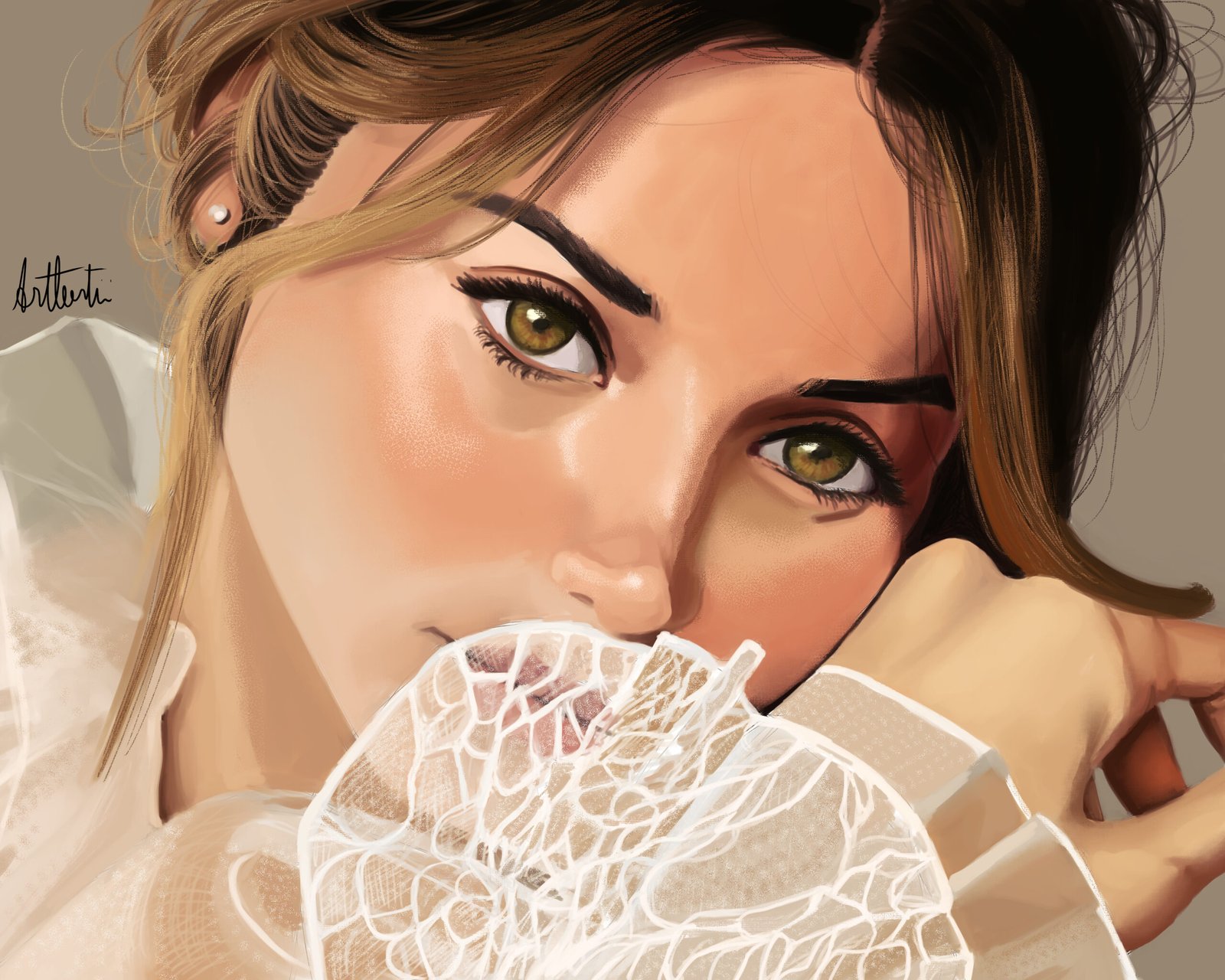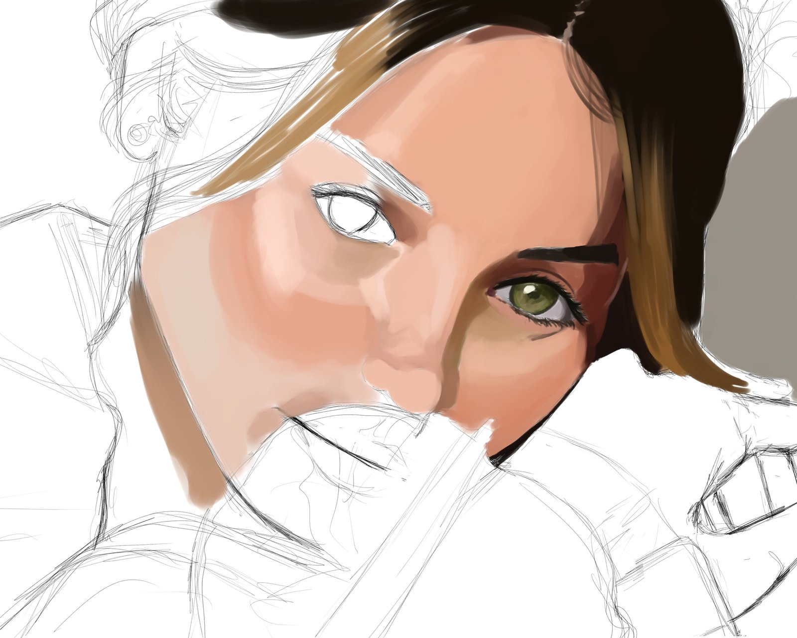 This artwork was very straightforward, just following the colors present on my reference photo, the tricky part is exactly that, adding the right colors to make it looks real. When you look to a complete photo, the colors are already there, mixed and blended together, creating the appearence of a smooth skin. When you are going to paint, you need to put colors close to the reference on the canvas and blend it, add different values and blend it again, rince and repeat, until you have a smooth looking skin color, like what is starting to happen on her left cheek. How to select the right colors requires a very long explanation, but in short, the more you paint and study, the more you notice that all skin tones have “rules” to how colors behave in certain weathers and light ambients.