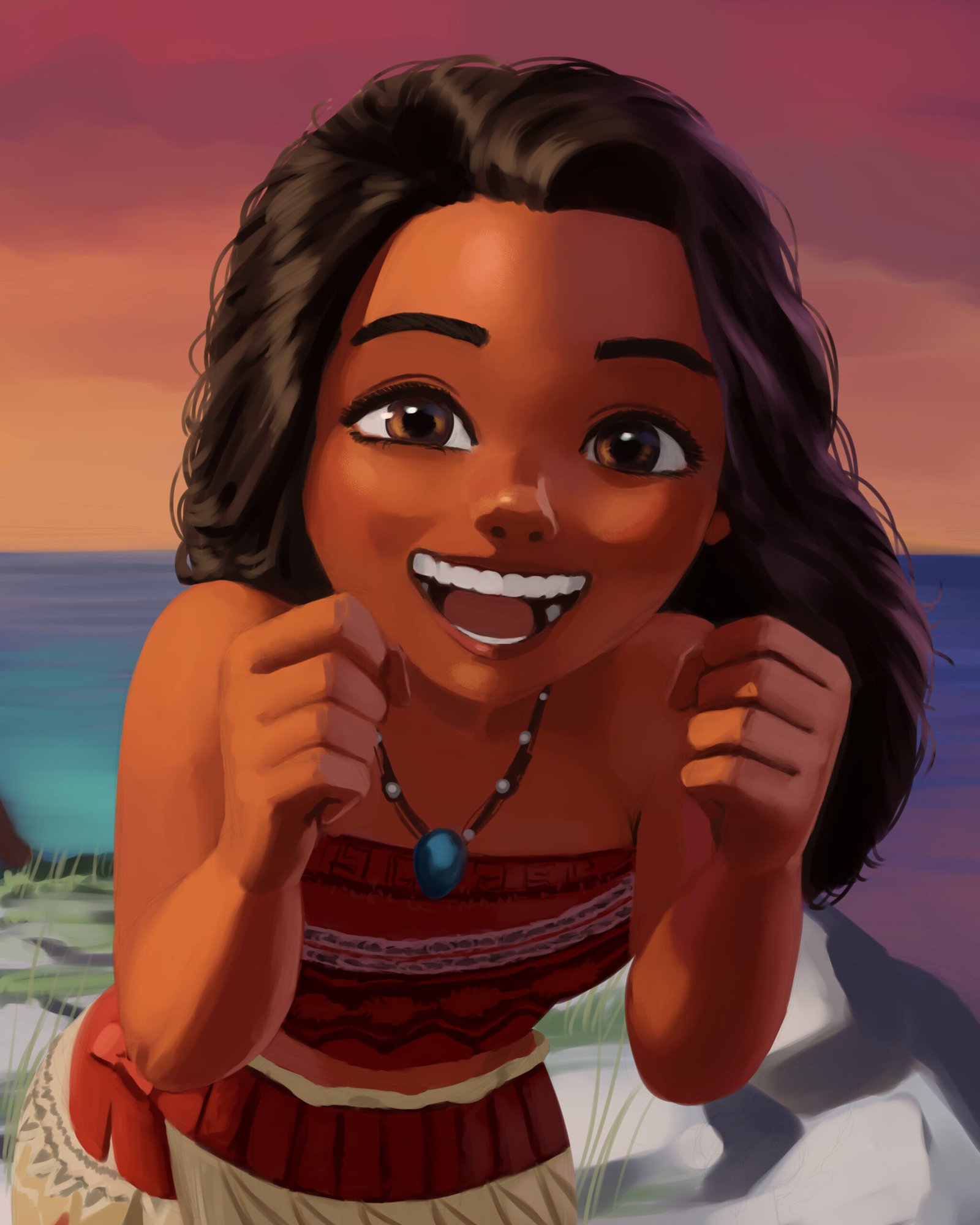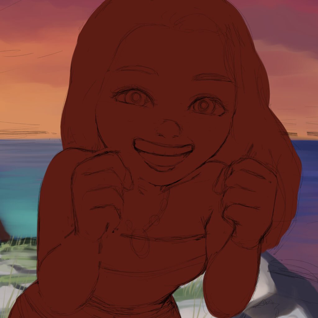 All right, for the first stage of rendering the artwork, I added some basic colors for her, based on the reference pictures I looked from Moana and painted some shades and bright areas just to have an idea of how it would look. So, for this painting, I only looked for references to have an idea of her features, but I didn’t have any references for the background, lights or her pose, so I had to do some experimentations here. One thing that really helps me to find the “atmosphere” from my paintings, is actually painting the background or at least the base colors for the background first. With that, I can find the colors I am trying to imagine for her easier, since some of the colors on her must reflect her surroundings, to make the “atmosphere” work and looking like she belongs there.